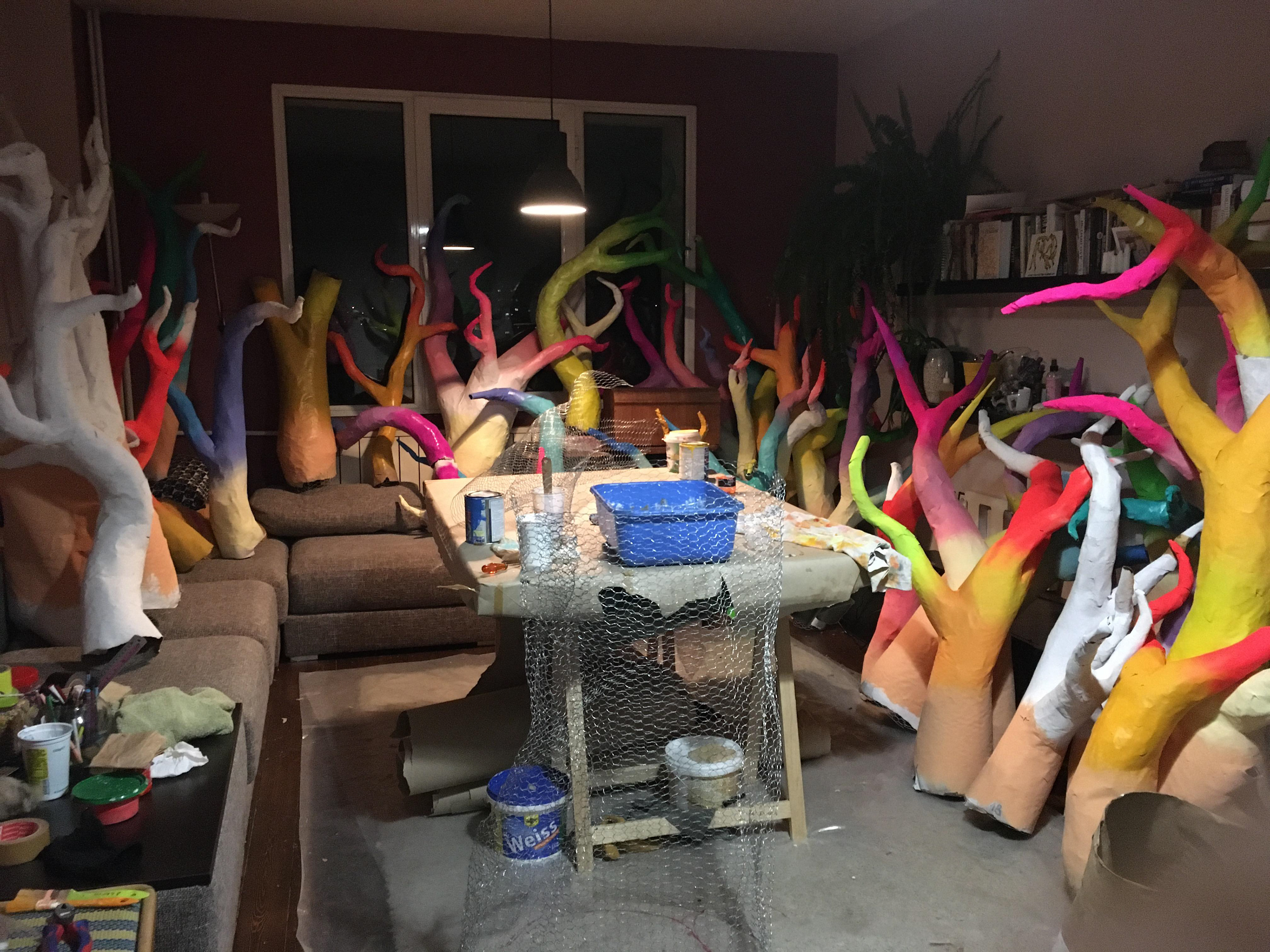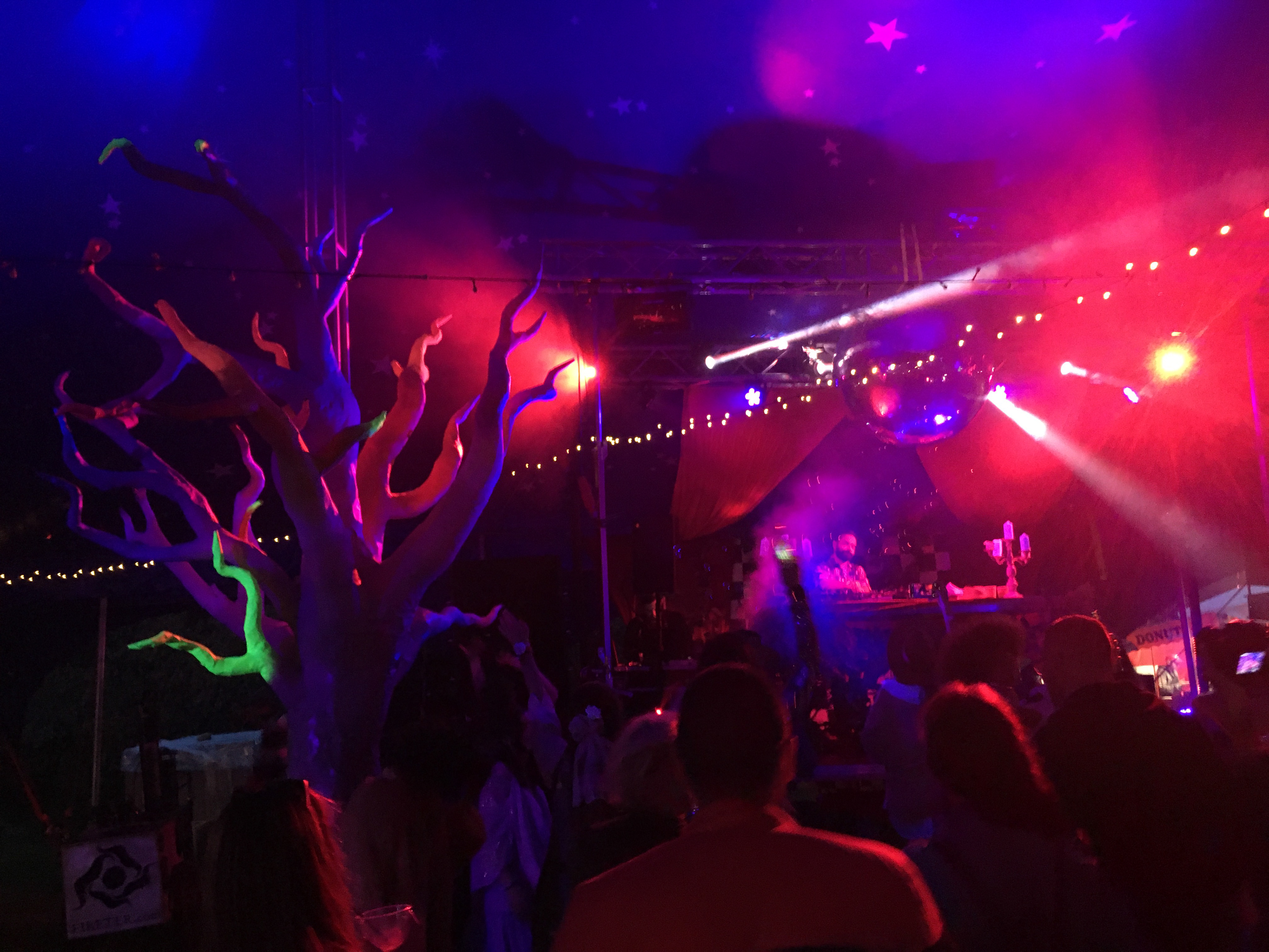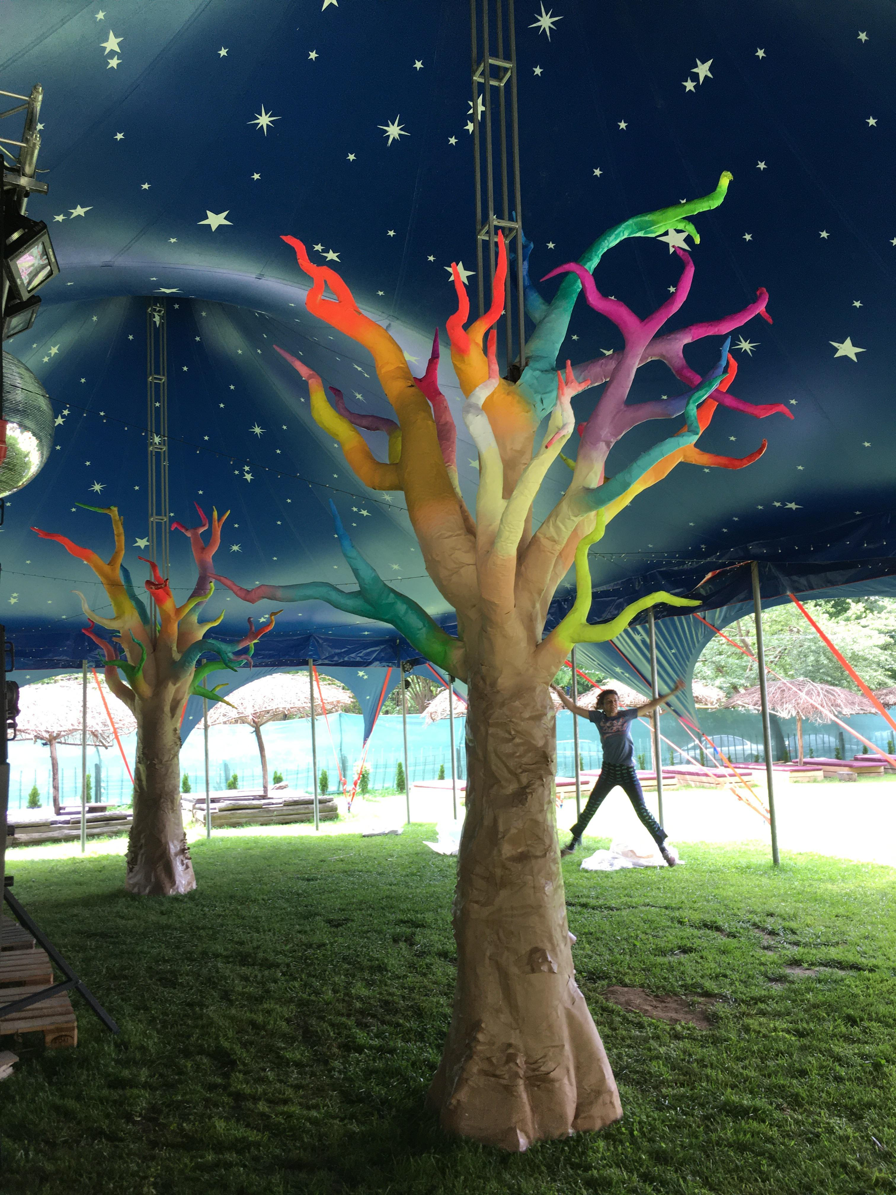 Fluorescent trees under the party tent. Флуоресцентни дървета под парти шатрата