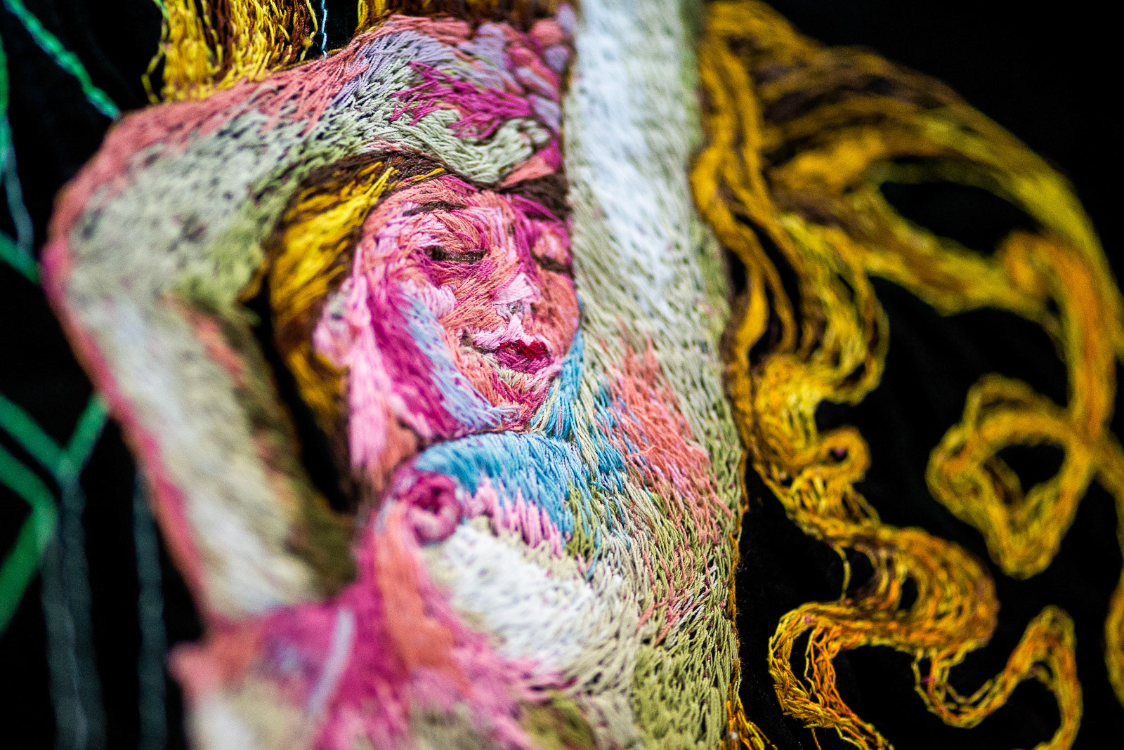 Бродерията като стереотипно женско занимание и мъжкарското яке за мотоциклет се комбинират и променят баланса на силите в тази хумористична феминистка интерпретация на класическата творба на Кабанел от 1863г.