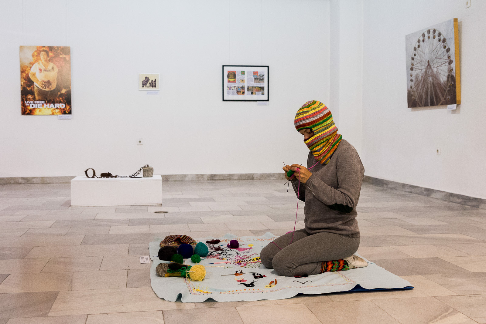 Седях в изложбеното пространство и плетох терлици и балаклави в продължение на седмица за 23. Международно биенале на хумора и сатирата в изкуството